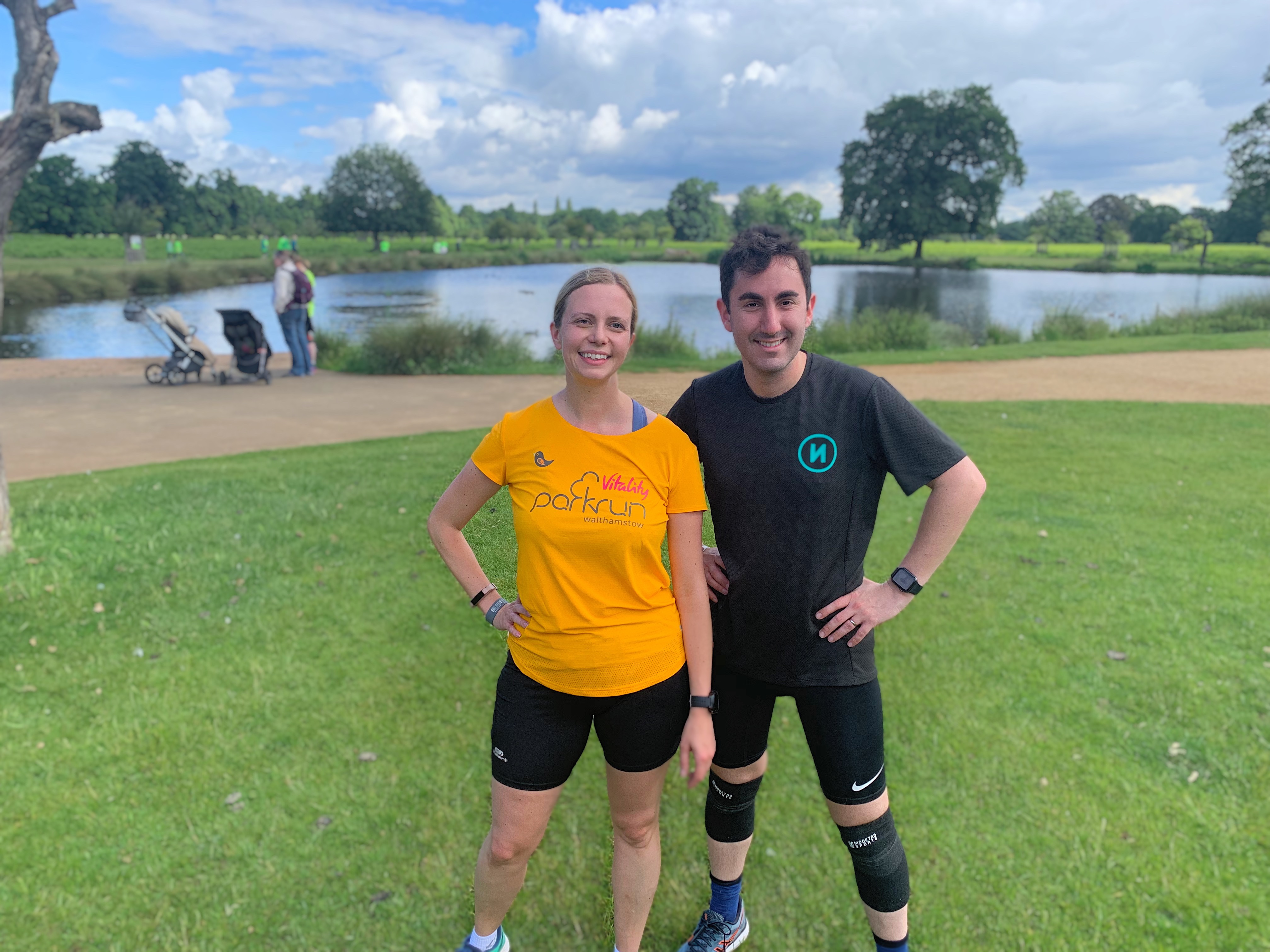 After a little skirting around a very pretty lake, I could see the finish line fast approaching. With so many runners to handle, Bushy have implemented a rather impressive ‘double funnel’ finish system, with runners being ushered into alternating queues with military precision. I’m not sure what kind of timer they were using, but it also looked rather more high tech than our simple stopwatches, presumably to cope with the peak times where multiple runners are crossing the finish line per second. With all credit to Bushy, everything ran absolutely perfectly. We were scanned in in no time, leaving us free to enjoy the cake and champagne brought along by people celebrating their 500th run!