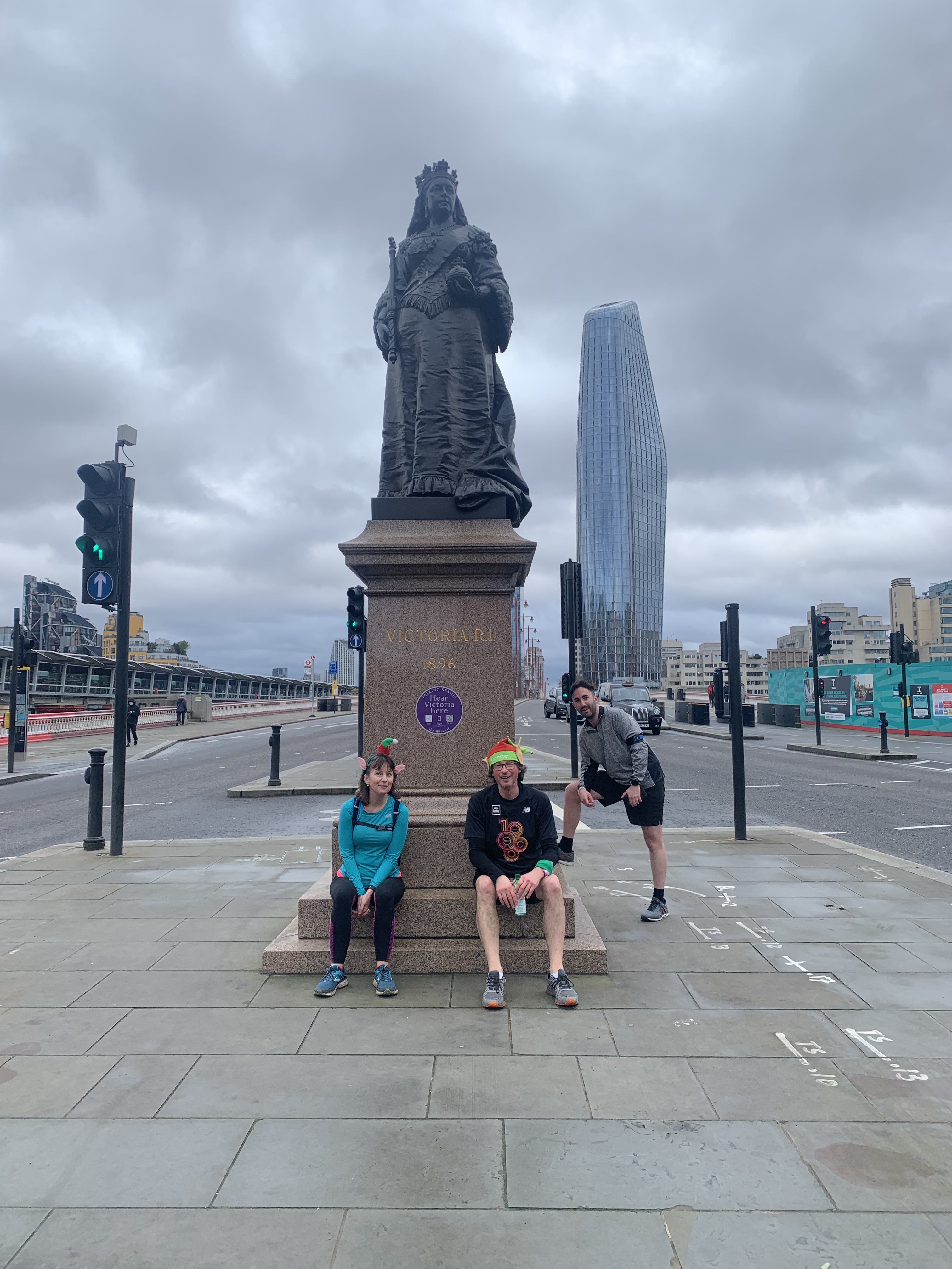 We were taken on a tour of the almost deserted city, around Bank, St Paul’s cathedral, the riverside paths and London Bridge. What struck us was how many little interesting details were all around us, but we had never stopped to notice before; tiny churches and unusual statues hidden amongst the tall city buildings. It felt such a treat to have the city almost to ourselves. One clue took us to the site of London’s first public drinking fountain, nestled into the railings of St Sepulchre church, where we learnt that the tiny fountain used to flow with wine on important days such as the coronation of George V. Another clue took us to Postmans Park, a tranquil little spot next to St Barts hospital where we spent some time reading the incredibly moving stories depicted on the Memorial to Heroic Self-Sacrifice . One plaque was particularly poignant to our team of friends from Walthamstow, as we read of an 8 year old local boy who died saving his younger sister from a fire. As the morning passed, we started to spot other little groups of runners out and about, phone maps in hand, criss-crossing our path as we all went in search of the clues.