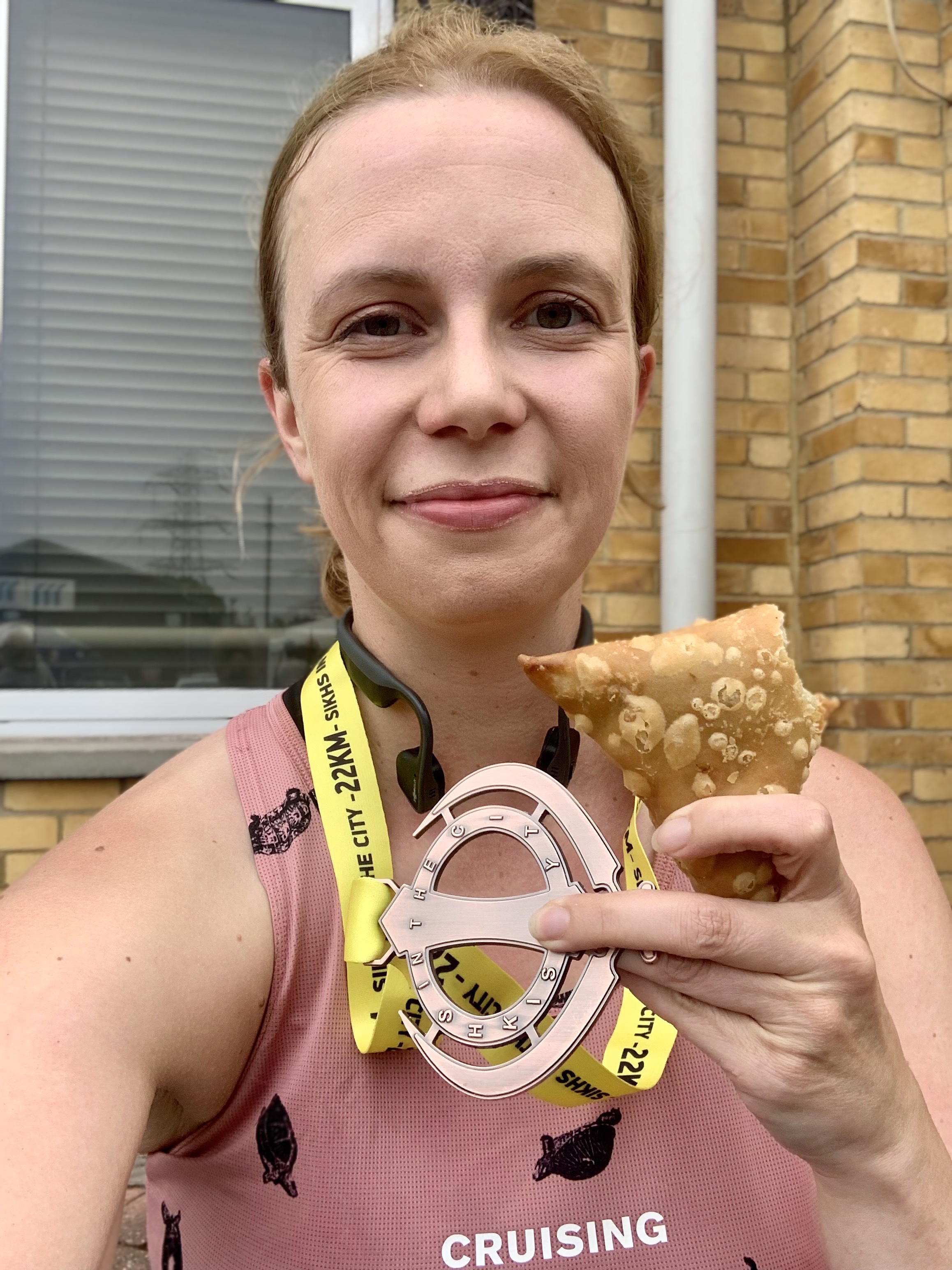 The route was a 2.014km officially registered circuit around the local streets of Woodford, known as the Fauja Singh training route. I naively assumed that any run around here would be totally flat, but instead there was a substantial long slow hill for all of the first 1km, followed by a welcome gentle fall down to the start/finish area. It gave the race an interesting rhythm as I settled in, listening to my audiobook. 1km up, 1km down. Up through the houses, down the main road. And repeat. By lap 4 my left foot was completely numb and I couldn’t quite understand why until I remembered the timing chip that we had tied around our ankles earlier which was now too tight! Loosening the anklet was a big relief and I continued round, enjoying watching the live scoreboard update with our names and positions. The hill finally started to take it’s toll, and after a strong first 16km, I had to ease back a bit and have the odd walking break to allow my breathing to get back under control. I was very happy to finish after 11 laps and take my 22km medal!