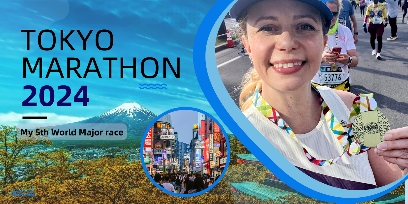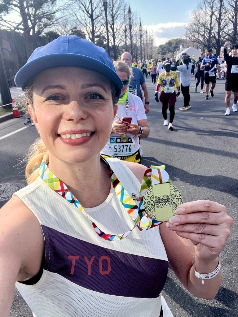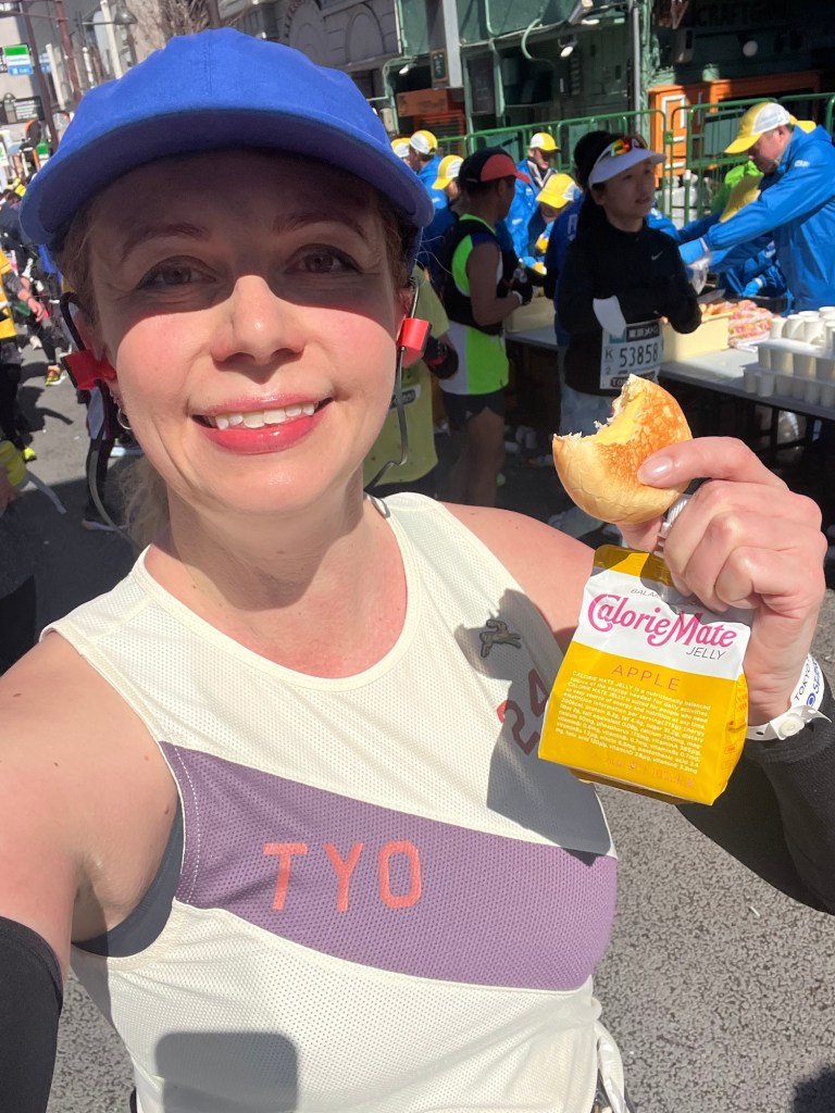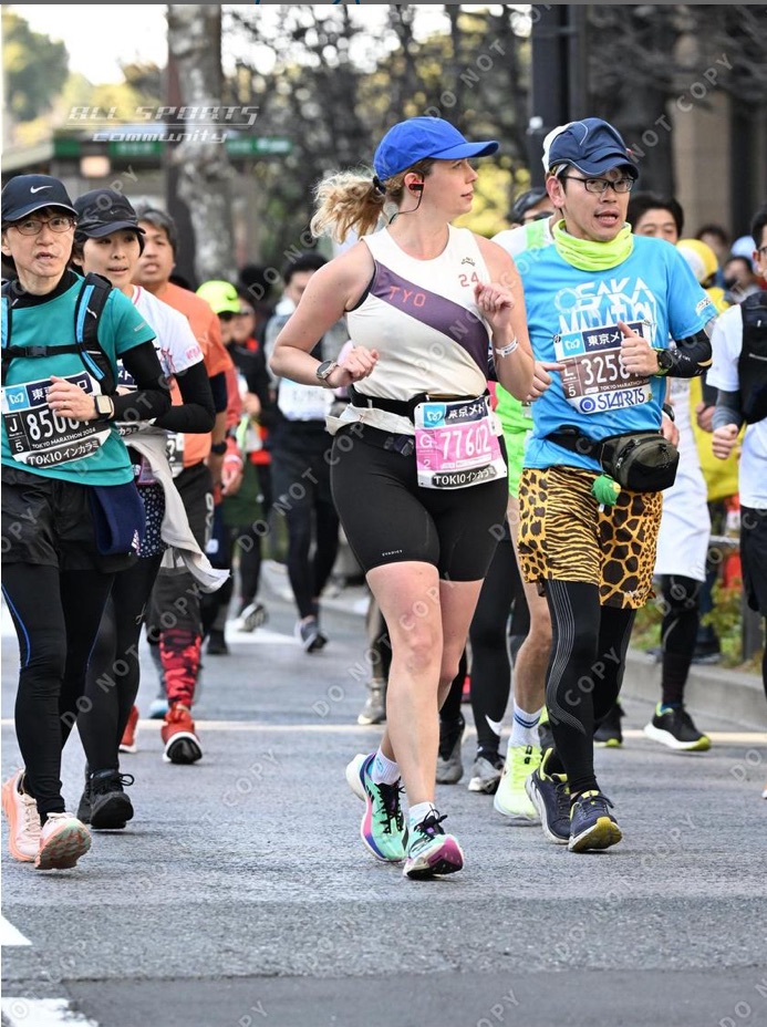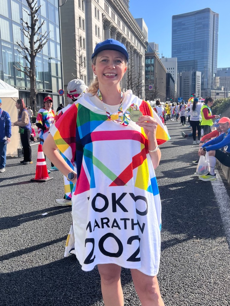 The streets were full of smiling spectators, and I was surprised to see how many had turned out in fancy dress to cheer on the runners. I went past countless Mario’s and Luigi’s, along with the more elaborate Anime dolls and even a Mount Fuji! Due to the ban on carrying water bottles, I made sure to stop at nearly every aid station. Alongside the water we were offered the local special electrolyte drink Pocari Sweat (which luckily tasted better than the name might suggest!). The snacks on offer were equally intriguing, as I found myself eating custard buns, temple shaped cakes and even pickled plums. The route itself felt pretty flat and wide open, with lots of double-back sections giving you the chance to spot the elite runners and your friends going past on the other side. The streets were absolutely spotless and free of litter, everyone doing their utmost to respect the local culture of cleanliness. Before too long, the end was approaching, and the supporters shouted ‘gambare!’ an encouraging saying meaning ‘do your best’, and held up signs which read ‘fight’ which made me quite emotional. As we turned the final corner and passed under the finishing arch, exhausted and slightly sunburnt, we were wrapped up in beautiful brightly coloured towel ponchos, one of the best finish line momentos I have seen!